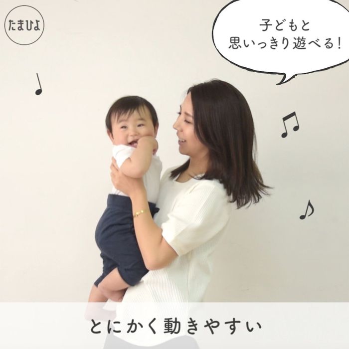 ゆとりのあるラフなシルエットだから、動きやすいのが魅力。抱っこをしたり、子どもと一緒に遊んだりするときに、腕や手をおもいっきり動かすことができますよ。