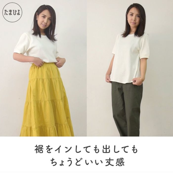 Tシャツの裾をパンツにインしても、ラフに出しても、スタイルが決まるちょうどいい丈感。パンツにも、スカートにもお似合いです。