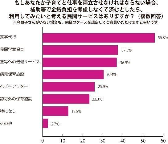 主婦に特化した人材サービス『しゅふJOB』が、子育てと仕事の両立のために金銭負担を考慮せずに利用してみたいサービスについて調査したところ、2位に民間学童保育という回答があがっていました。(『しゅふJOB』調べ)