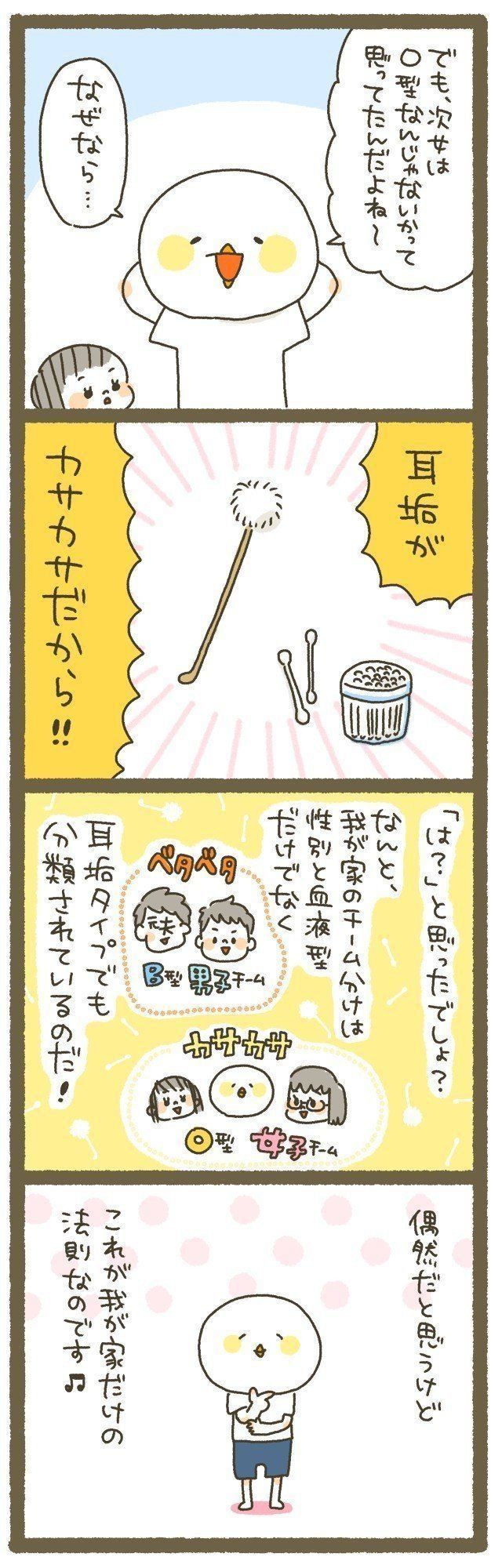 ちなみに、私はO型の両親から生まれたO型で、私のきょうだいも皆O型。耳垢は家族全員カサカサ。