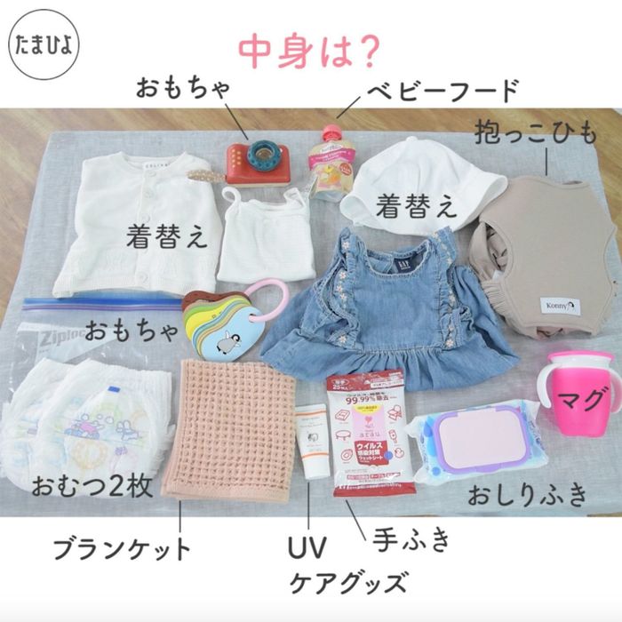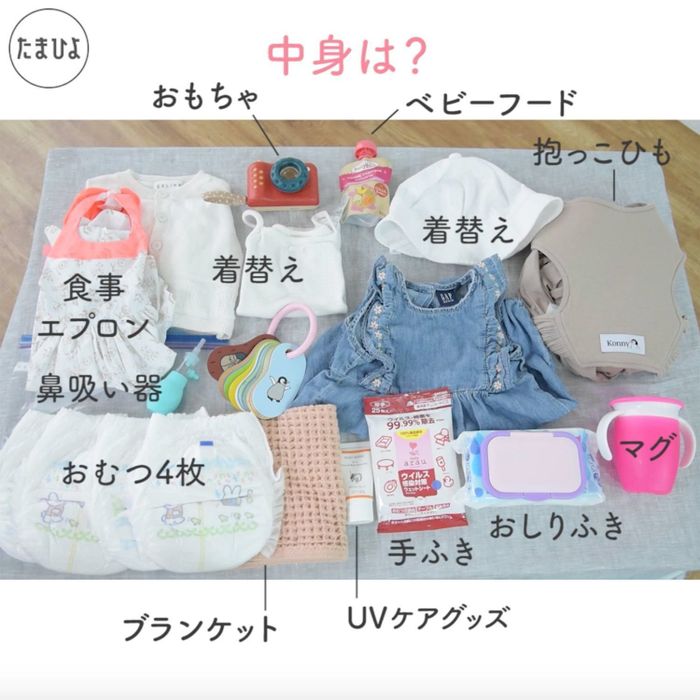 着替えは肌着とはおりもの、帽子などを一式。グズったときように抱っこひもも携帯。