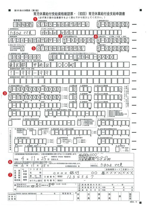 雇用保険に加入している人が使用する「育児休業給付金支給申請書」の見本です。実際に記入する際の参考にしてください。