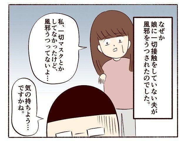 娘が風邪を引きました。私はマスクをしないで(暑かったので…)一緒に寝たり、つきっきりで看病をしていました。一方夫は夜遅くまで仕事でほとんど家に居らず、しっかりマスクや除菌をして予防をしていました。