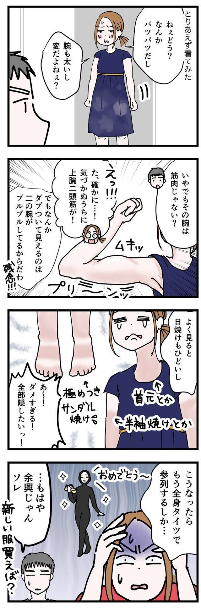 産後の体型の戻りもイマイチな状況の中、ちょっと嬉しい変化だったのは上腕の筋肉!毎日約10kgの次男を抱き、たまに15kgの長男も抱く…。次男の乗ったベビーカーを抱えてバスを乗り降りすることもしばしば。よく考えたら筋肉もつきますね。でも二の腕の振袖お肉はプルプルとしていて、上は締まっていても全体的には太い!という印象。振袖をなくせばノースリーブも怖くないかもですね。