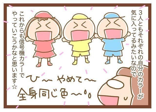 大好きすぎて、上から下までのコーディネートを同じ色で揃えて外に出たがるのはちょっとやめてね三つ子たち!(笑)