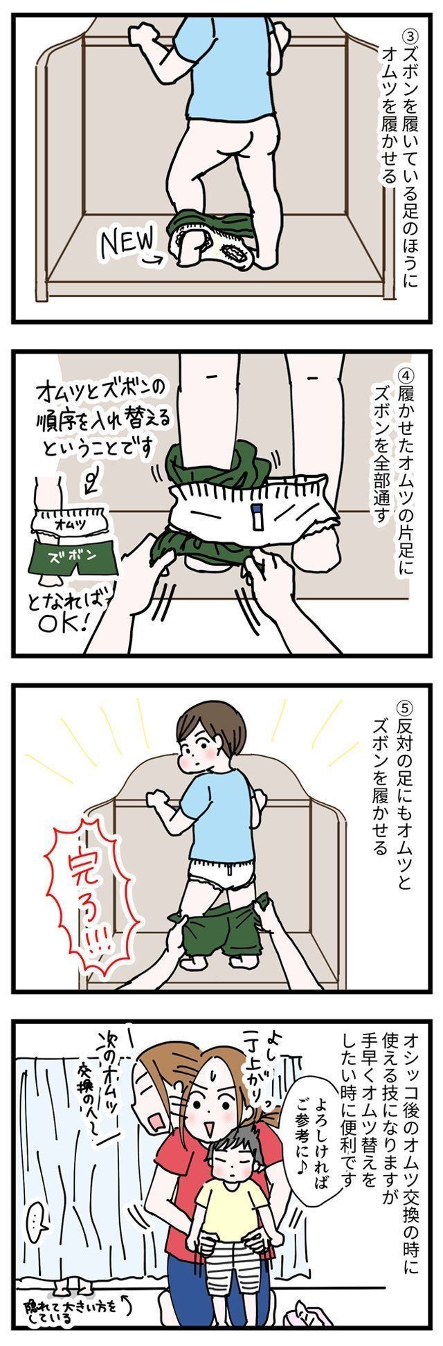 慣れるまではどういう手順だっけかな?と面倒に感じるかもしれませんが、習得してしまうと、素早くオムツ交換&スボン装着ができると思います。私は特に外出時によくこの方法でオムツ替えしています。
