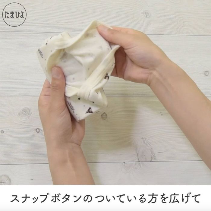 スナップボタンのついていない部分を片手で抑えて、スナップボタンのついている方を裏替えしに広げます。