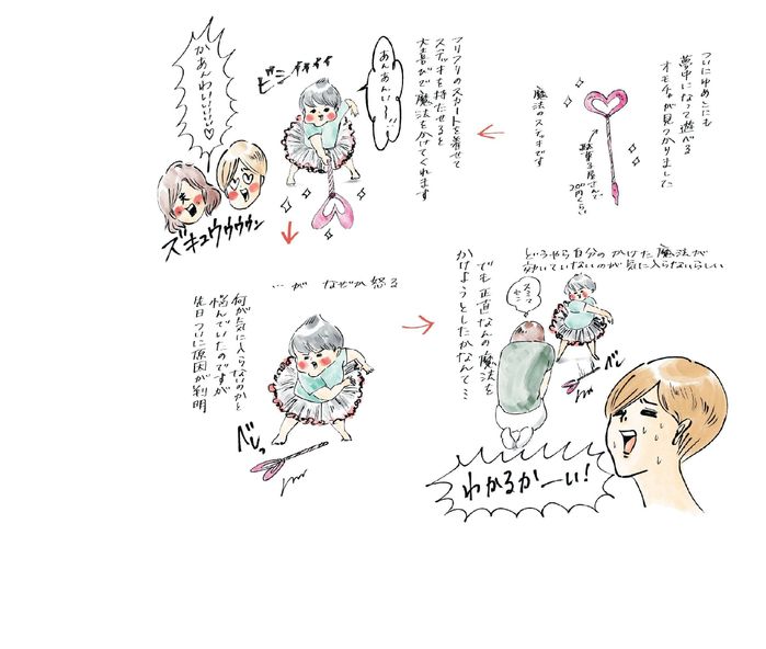ついにお気に入りのおもちゃを手に入れたゆめこちゃん。それは魔法のステッキ!そんなゆめこちゃんにまわりは胸キュン!長男・まめちゃんの言動をコミカルに描いた育児絵日記が、インスタグラムで大人気の横峰さん。この連載では、第2子・ゆめこちゃんが主役!