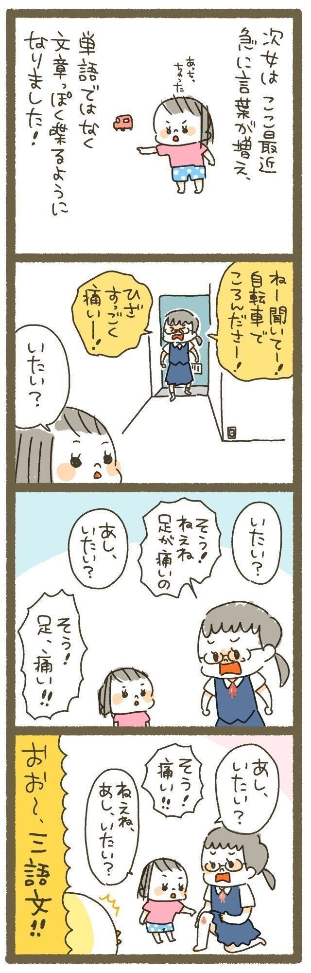 次女2歳半。はじめての三語文は「ねぇね、あし、いたい?」でした!