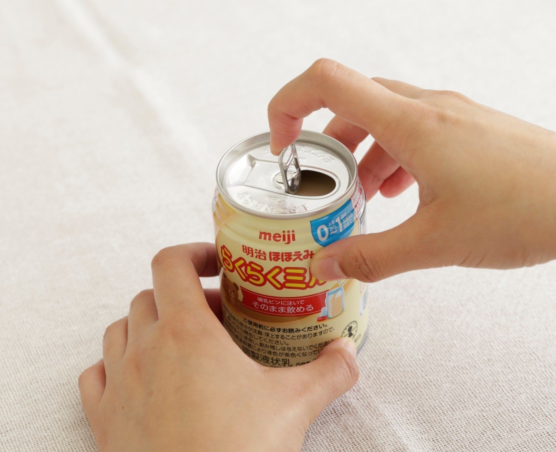 缶を開ければそのまま哺乳びんに移し替えられるので、とにかくラク。スチール缶のため頑丈なので、バッグの中でつぶれる心配がありません。