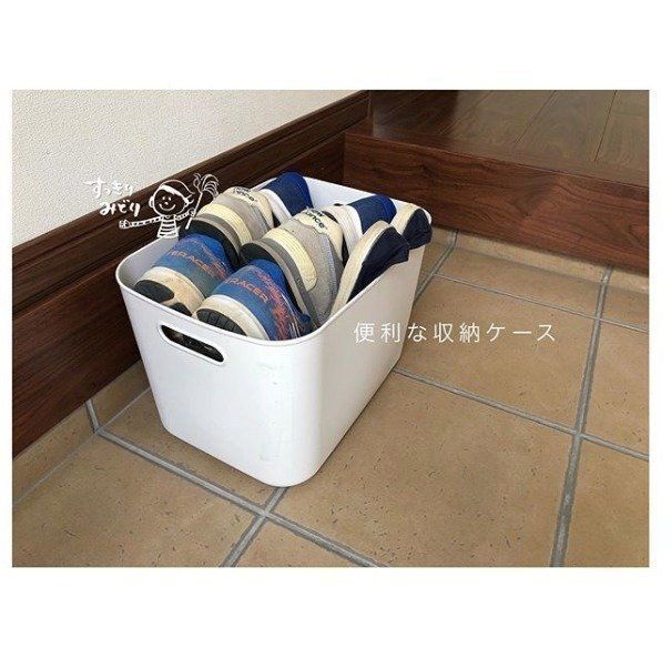 幼稚園のお子さんを持つAkiさんは、やわらかポリエチレンケースを使って玄関に子どものための身支度コーナーを設置。朝、子どもたちは必要なものをケースに入れてリビングへ持っていき、自分で身支度をするんだそうです。子どもが使うのにちょうど良いサイズと形だからできる良いアイデアですね。