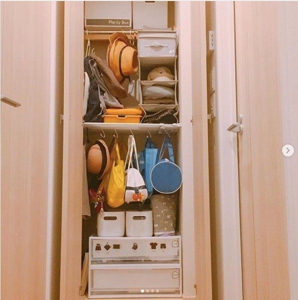 MIHOさんは、丸型の中サイズケースに帽子を収納しているそうです。季節ごとにわけて重ねているとのこと。しまう場所に困る帽子もスッキリ収納できて便利!
