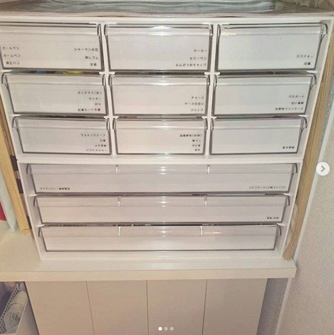 misaさんはリビング収納にレターケースを活用。文房具や雑貨も、ラベリングすることですっきりとわかりやすく収納することができまね!表面が真っ白なので、こまごました物を収納していてもごちゃついて見えないのがうれしいです♪
