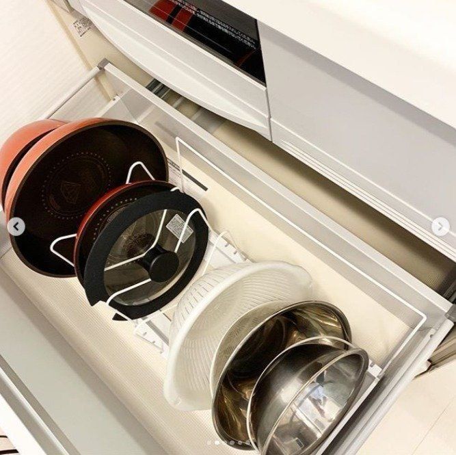 ◾️二人暮らしのお部屋記録さんは、ざるボウルフライパンスタンドを活用。組み立ても簡単で、幅の調節が出来るから、どんなアイテムでも対応してくれるのが嬉しいとのこと。フライパンやボウルは縦に収納することで収納しやすく、取り出しやすくもなりますよね♪