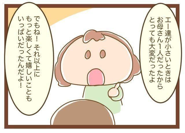 その時はちゃんとしっかりフォローするようにしてます。大変だったのは事実なので、そこは隠さずにちゃんと伝えて。でも、それ以上に3人が居てくれてお母さんは幸せなんだよ!と。