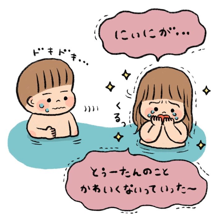 私は一部始終見ていたのですーちゃんがただアピール泣きしていることがわかったのですが、その時のひーくんのびっくりしておどおどする姿を見て「お兄ちゃん苦労かけるね…」と