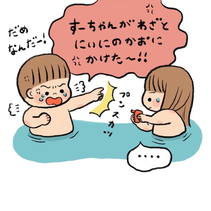 間違ってすーちゃんがひーくんの顔に水鉄砲で水をかけてしまいました。