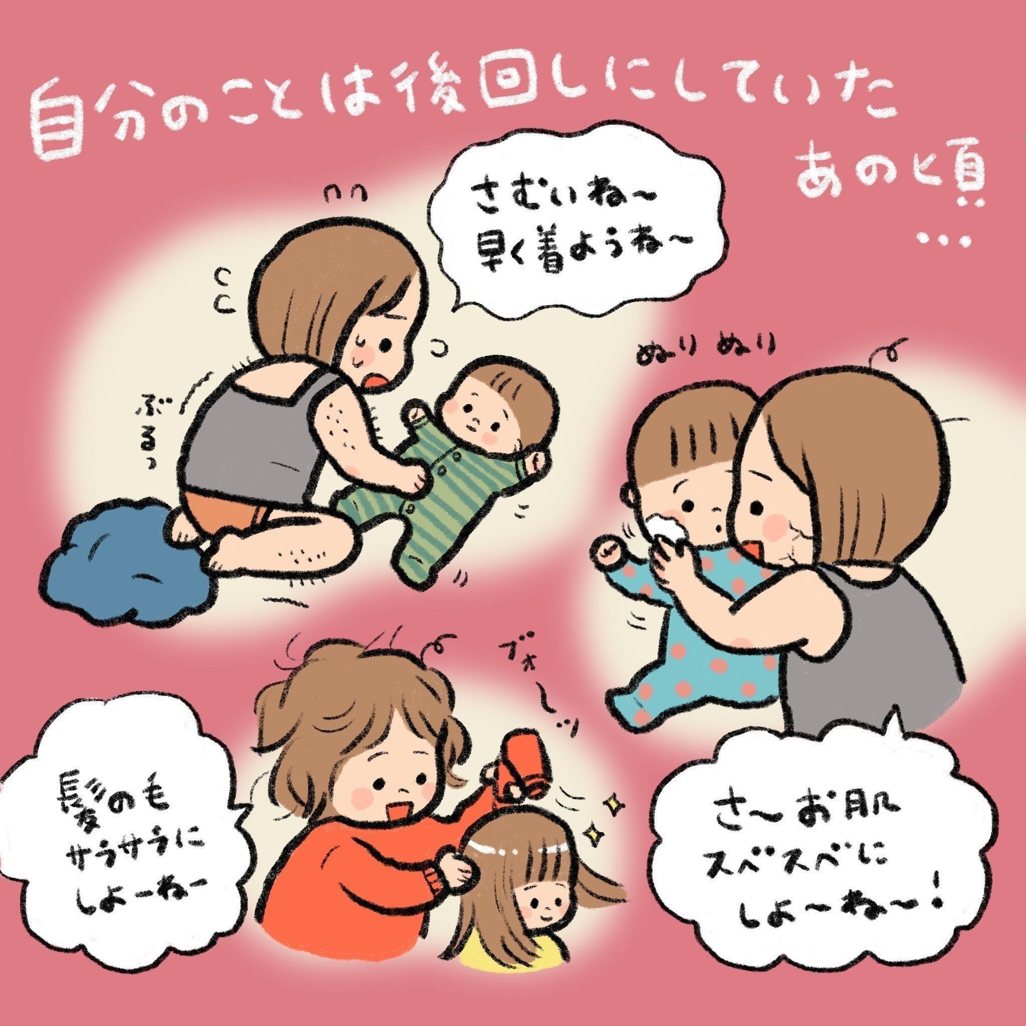 2人でお風呂で遊んでいる間に自分のスキンケアやヘアケアもできるようになりました。