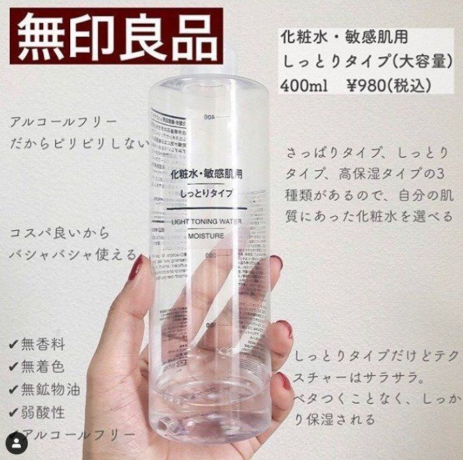 Calino Beautyさんは無印良品スキンケアラインの中でしっとりタイプを愛用中。400mLで1000円弱とバシャバシャ使えるコスパが◎!しっとりタイプのほかにも高保湿タイプやエイジングケアタイプなどラインナップが豊富なのもうれしいポイント。インスタでも愛用しているという方が多いアイテムでした。