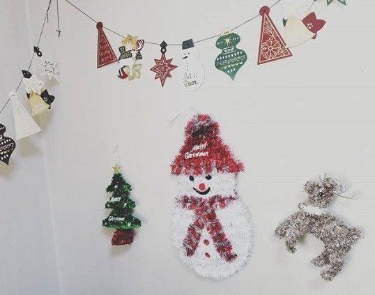 100均アイテムでクリスマス仕様の壁に仕上げたというHiromi.Mさん!おしゃれなガーランドや、キラキラした雪だるま達がとってもかわいいですね♪