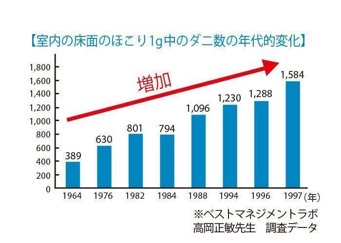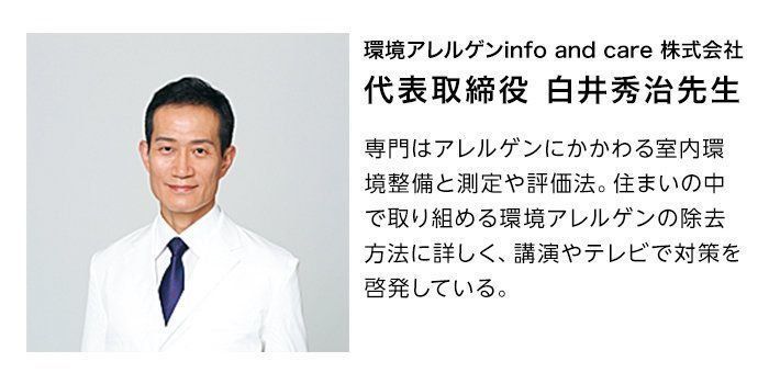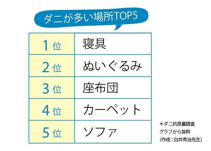 室内で見つかるダニの約8割を占めるといわれているチリダニの数は、昨今増加する一方。白井先生によると「ダニは住まいの中で人がよく触れるもの、布で綿などの詰め物を包んだもの、毛足の長いものに多く潜んでいます。とくに寝具には、ダニの餌となる人のフケや垢が多く、寝具などに付着している皮脂汚れにはダニをよせつける特徴があります。