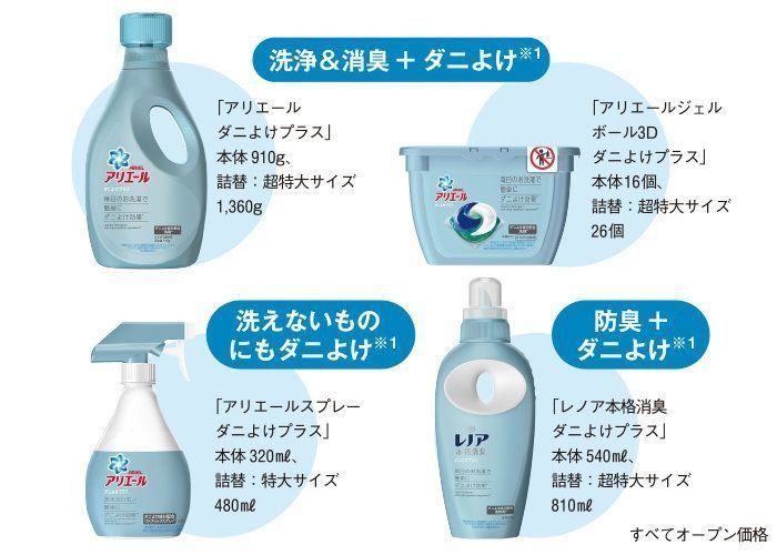 「アリエール」が本来持つ高い洗浄力で、生きたダニを誘引する皮脂汚れを除去。さらに、ダニが嫌がるさまざまな日用品やジャスミンなどのアロマ精油にも含まれる「ダニよけ成分(※1)」が働き、生きたダニをよせつけにくくすること(※1)が可能です。皮膚科医監修のもと、肌テスト済み(※2)。
