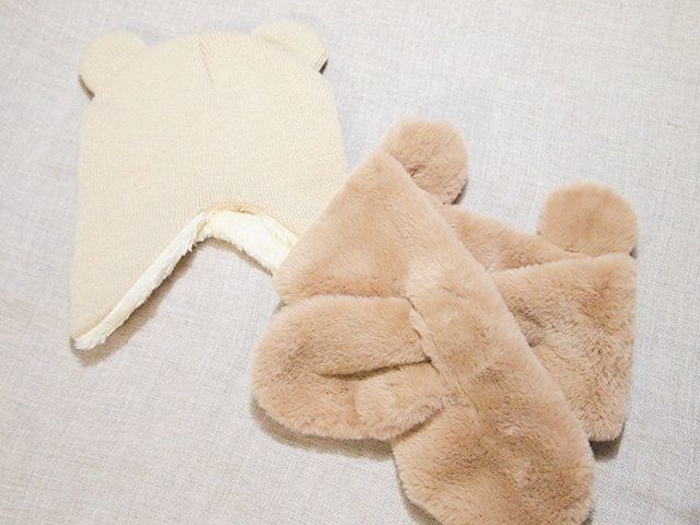 耳がついたキャップとふわふわのマフラーは子どもが身につけると反則級のかわいさ……! 子どもの帽子やマフラーって、出かけたときに落として失くしてしまうこともあるので、スリコで気軽に買えるのはうれしいです。