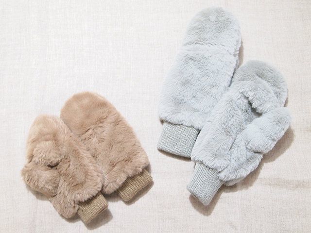 まず紹介したいのは大人気の「ファー2WAYミトン」。カラーはベージュ・ブラック・グレーの3色。右は大人用、左は子ども用の2サイズ展開です。お値段はそれぞれ500円(税抜)!