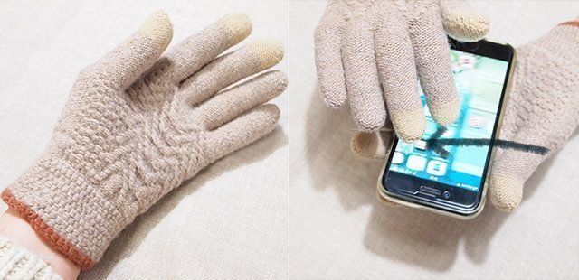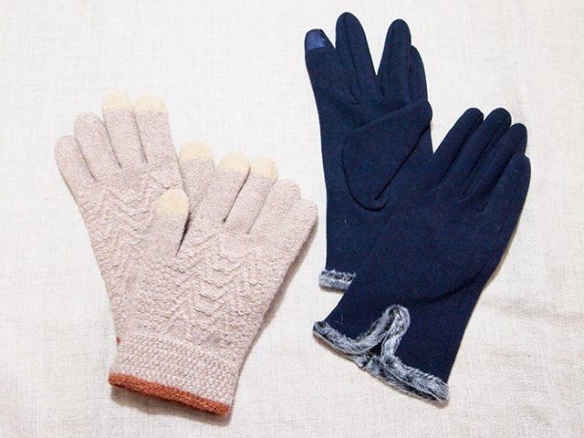 スマホ手袋も充実していました。カジュアルな「洗えるスマホ対応手袋ケーブル編み」(左)、右のキレイめな「ファー付きスマホ対応手袋」(右)どちらも300円(税抜)。左のケーブル編みの手袋はお洗濯が簡単にできちゃう優れもの!