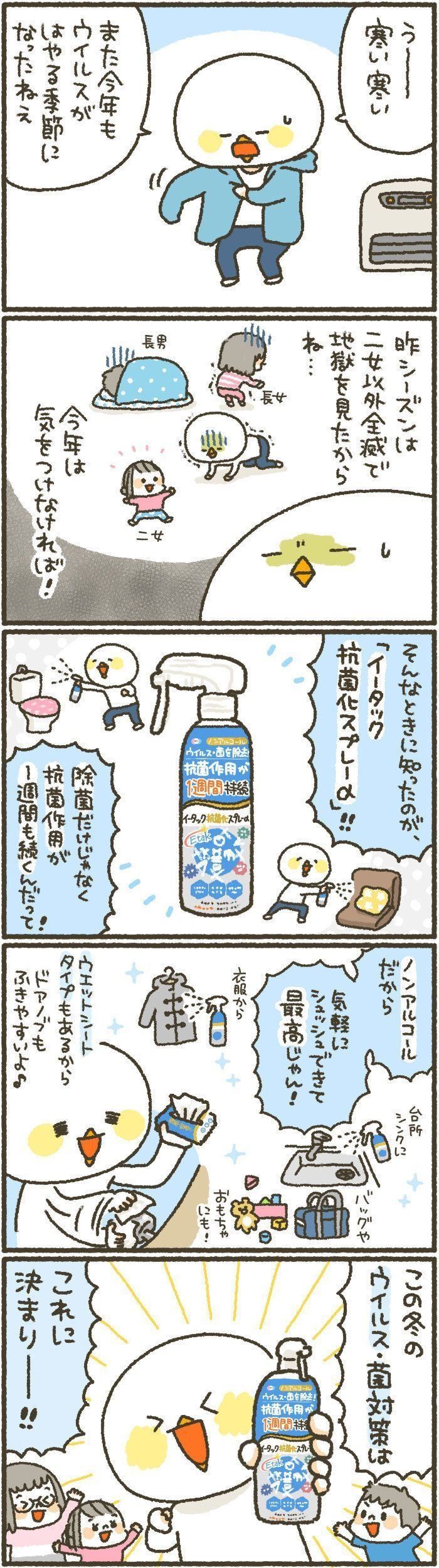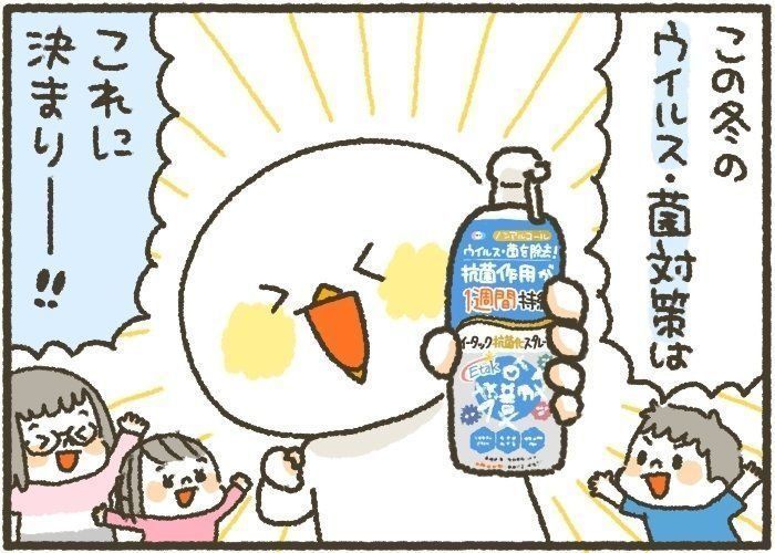ウイルスや菌がよりいっそう気になるこの時季。16才、13才、2才のママである、たまひよONLINEでマンガ連載中のマォさんも「子どもがいろいろなところを触ったり、その手を口にしたりするので、菌は気になる…。けれど、除菌アイテムの中にはアルコールタイプのものが多くて、子どものことを考えると抵抗が…」と悩んでいるそうです。そんなマォさんに、ノンアルコールでウイルス・菌対策ができるアイテムを試してもらいました!