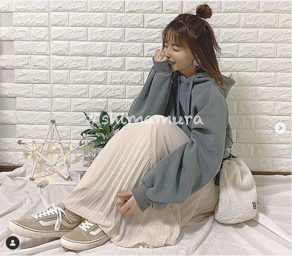 こちらは、しまむらとViViのコラボパーカーをゲットしたsatosukeさんのゆるかわコーデ。パーカーの袖のデザインが可愛くてお気に入りなんだそう。ロングのプリーツスカートとのバランスが絶妙でかわいい!