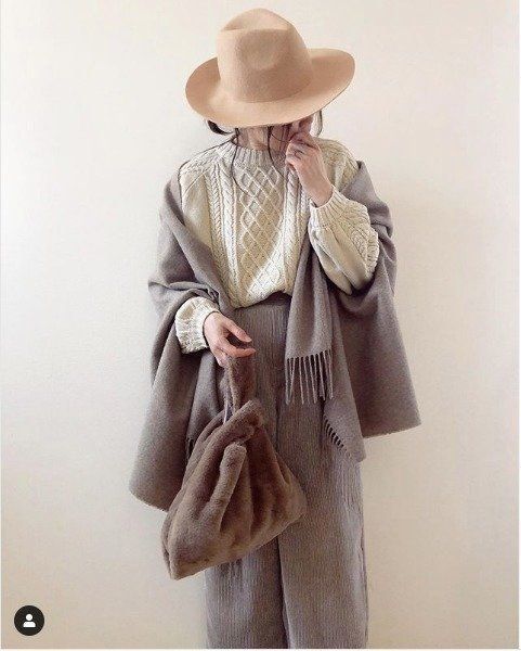 「しまむら×プチプラのあや」のコラボニットをゲットしたM.POさんは、ラテカラーのストールとパンツをあわせてコーディネート。ハットを使ってカッコよく仕上げたスタイルが素敵♪