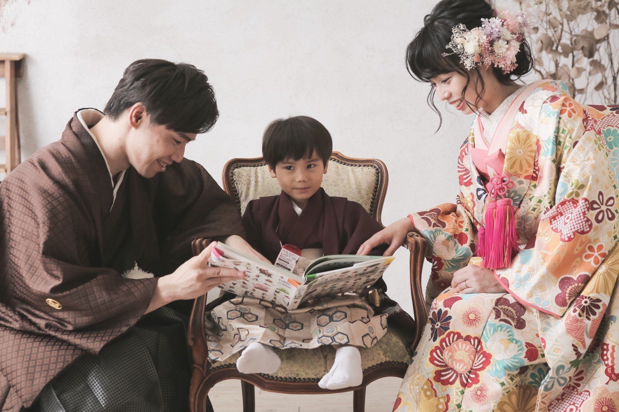 家族みんなが大好きだという「本」を結婚式のテーマにすることにしたまーみんさん。息子さんと3人で撮影した前撮りにも、家族の想い出の1冊を持って行ったそう。和装のほかに、大好きなブランドのTシャツをお揃いで着て撮影。まーみさん一家の個性がたっぷり詰まった前撮りになりました。