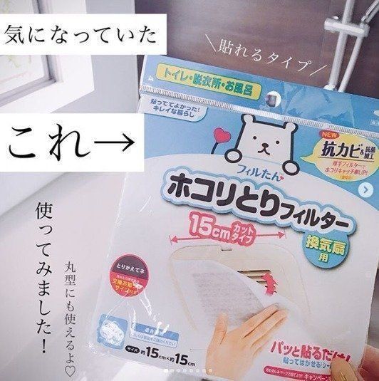 ricoさんは換気扇のホコリ予防にこちらのホコリとりフィルターを活用しているそう。シールタイプなので取り付けも簡単なんだとか!元は角型ですが、カットすれば丸形にも使用できるそうですよ。ホコリがたまってしまうと掃除が面倒な換気扇は、こういったアイテムでホコリ予防しておくといいかもしれませんね!