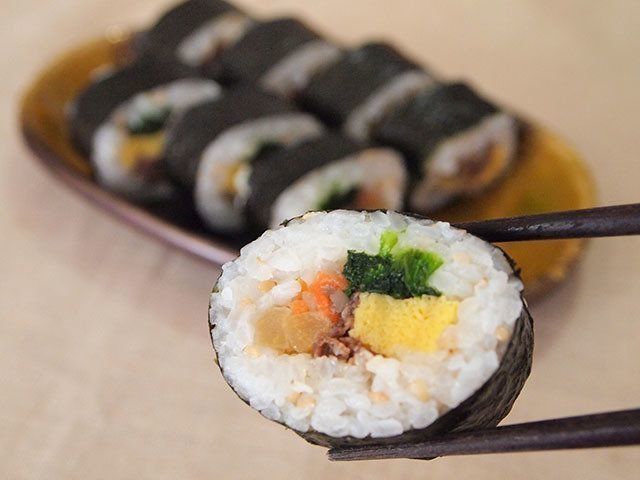 厚焼玉子・味付け牛肉・ごぼう・にんじん・塩蔵大根・ほうれん草など具沢山。ほんのり香るごま油がキンパの特徴。カロリーは低いのに、野菜のシャキシャキ感や牛肉の肉々しさもあるので、人気があるのも頷けます。自宅ではなかなか作れない料理だから、手軽に味わえるのはうれしいですね。お店で見つけたら即GETして欲しい一品です!