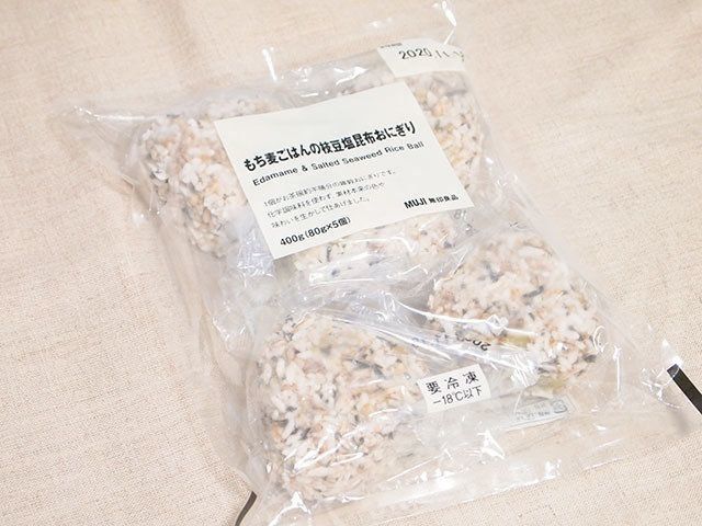 2位には「もち麦ごはんの枝豆塩昆布おにぎり」がランクイン。こちらも5位の鮭おにぎりと同様、個別包装のままレンジでチンするだけでOK。一緒に混ぜ込んでいる塩昆布と枝豆が絶妙なハーモニー! もち麦を使っているのでひとつ食べただけで満腹感があります。