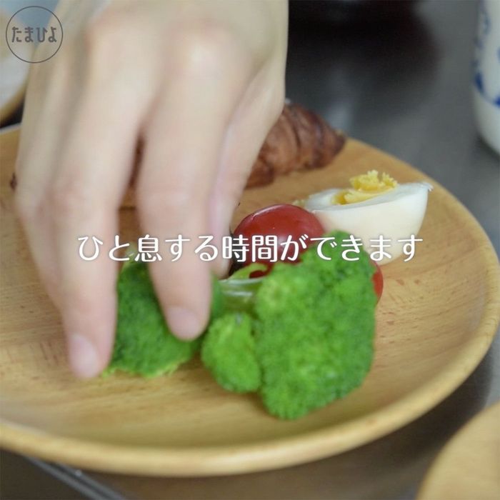 「朝は一番バタバタする時間。あらかじめ茹でて、作り置きしたておいたブロッコリーや卵をのっけるだけ。パンものっけるだけ。季節によってフルーツをのせたりもします。