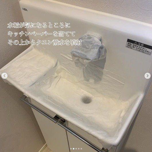 ken'sさんはクエン酸を使ったパックで手洗い場をこそうじ(小掃除)。溜まってしまった水垢も、クエン酸パックをすることで汚れが浮いてきてこするだけで簡単に除去できるんだとか。ぜひ試してみてくださいね♪