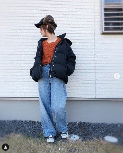 Mi-taさんはこれ1つで主役級の印象を与えるワイドフィットカーブパンツを購入。デニム生地なのでニットやダウンとの相性も抜群!いろんなコーデに合わせやすくていいですよね。