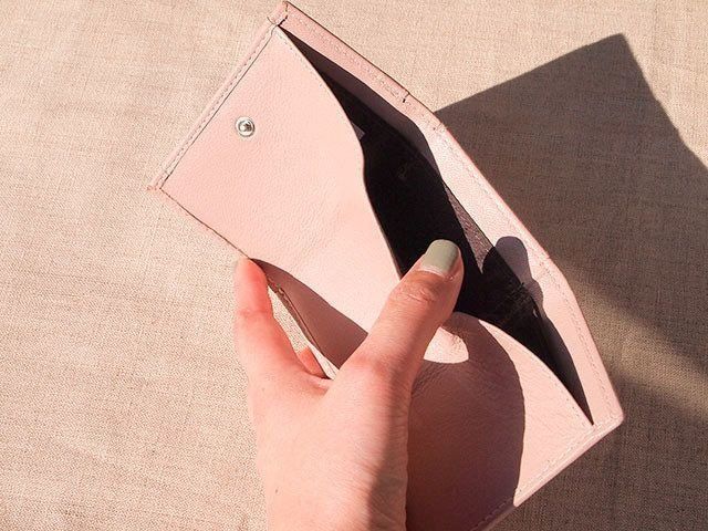 まずはこちらのミニ財布(左上)。片手にすっぽりと収まる小さいお財布ですが、お札も小銭もしっかり入ります。少量ですがカードも3枚入ります。コンパクトなのでメイン財布と一緒に常に持ち歩く場合はとても便利。お値段は980円(税込)。くすみピンクが今年らしいですね。