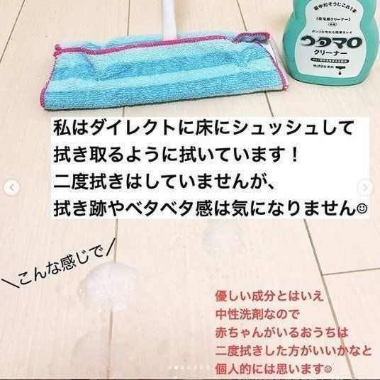 時短*節約レシピさんは床のこそうじ(小掃除)にウタマロクリーナーを活用!ウタマロクリーナーを床にシュッとして、フローリングワイパーにマイクロファイバー雑巾をつけたもので拭き取るだけ。二度拭き無しでも、拭き跡やベタベタ感は気にならないんだとか!ぜひ参考にしてみてくださいね。