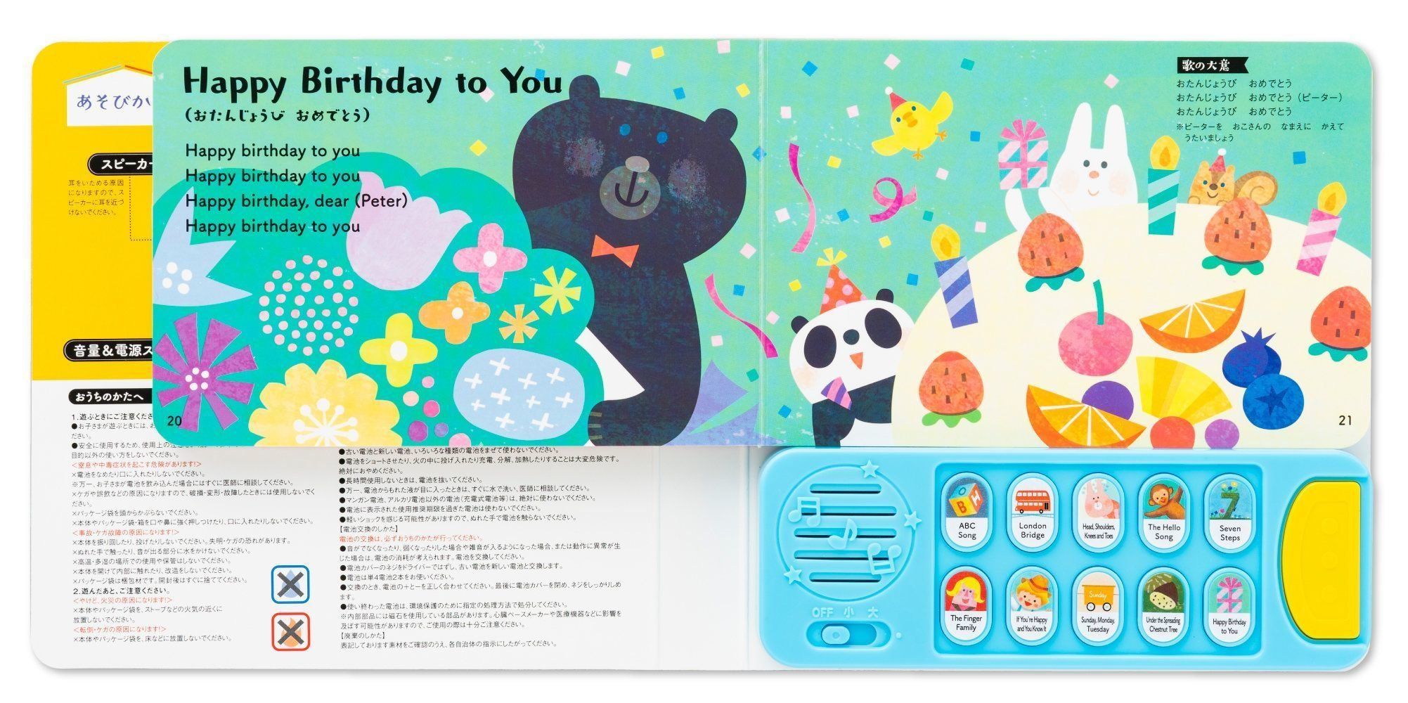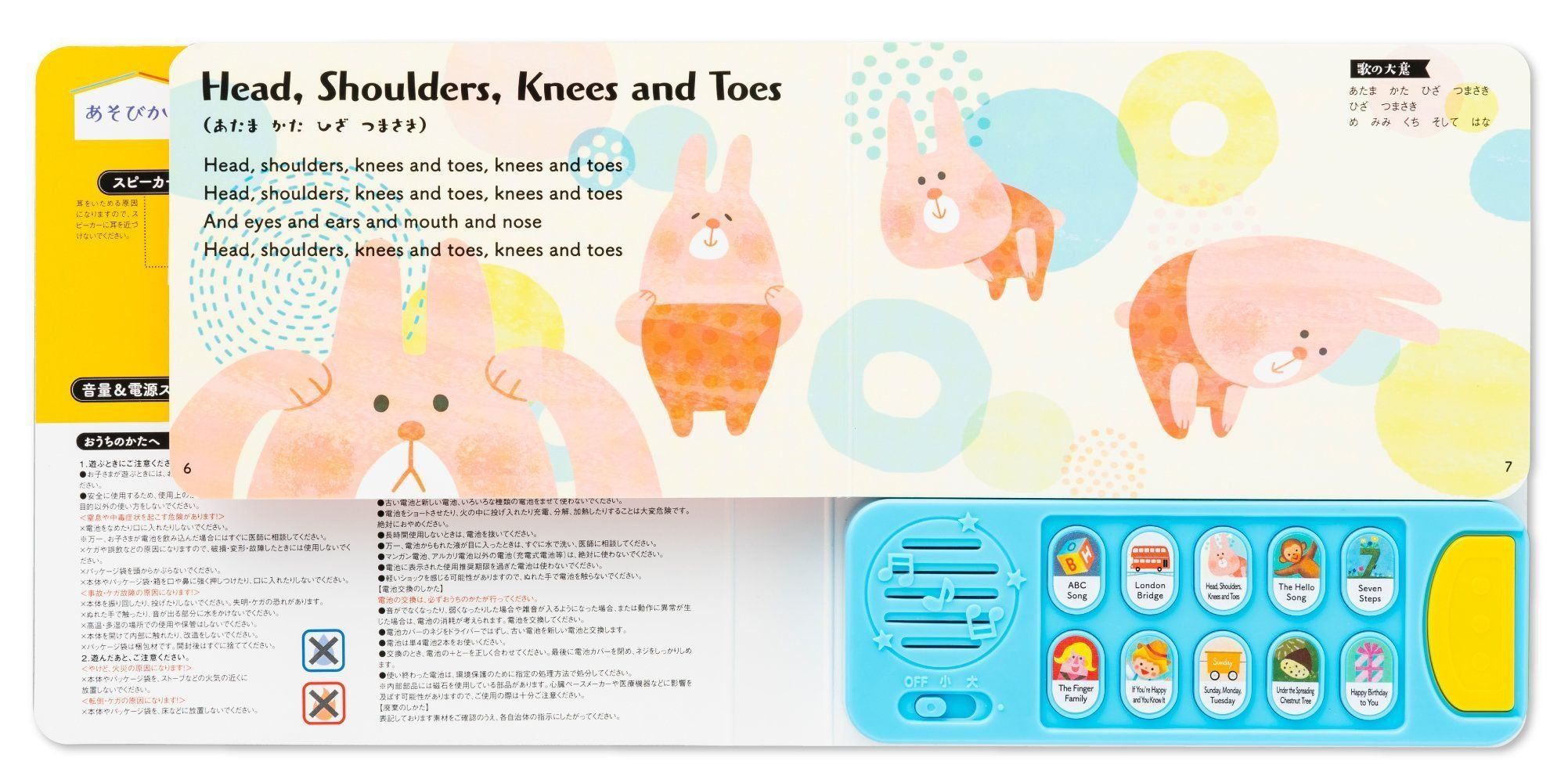 絵本の部分には、かわいいイラストと歌詞、英語の意味がついていて、おうたの世界が広がります。