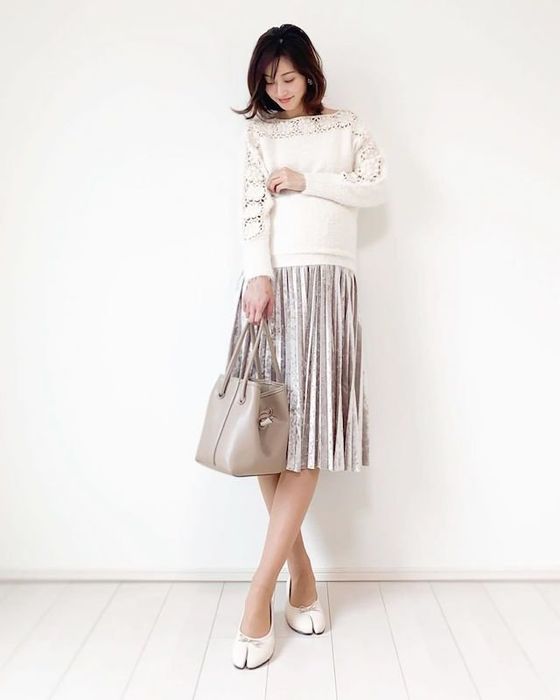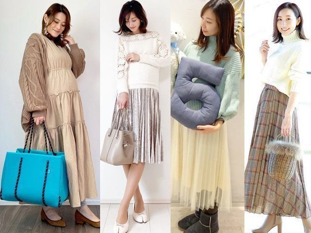 たまひよ grammerのERIさん(@eri_h11)は、臨月のときにこちらのコーデを投稿。襟元から袖にかけての透かしデザインがステキなニットは『FRENCH PAVE』で、スカートは『chicwish』、足袋のようなデザインのパンプスは『vivian』。