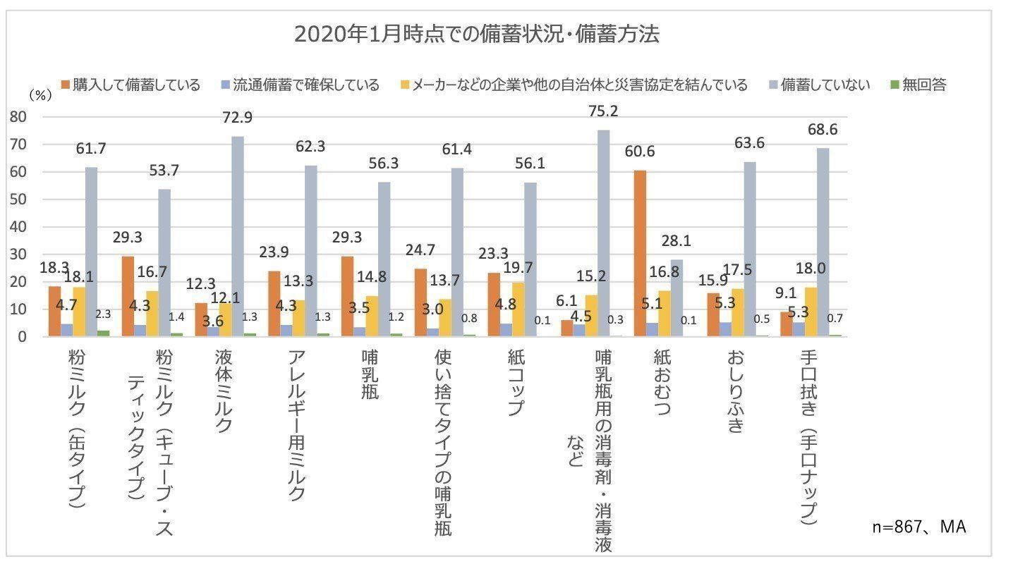 「紙おむつ」は6割、「粉ミルク」は3割の自治体が備蓄