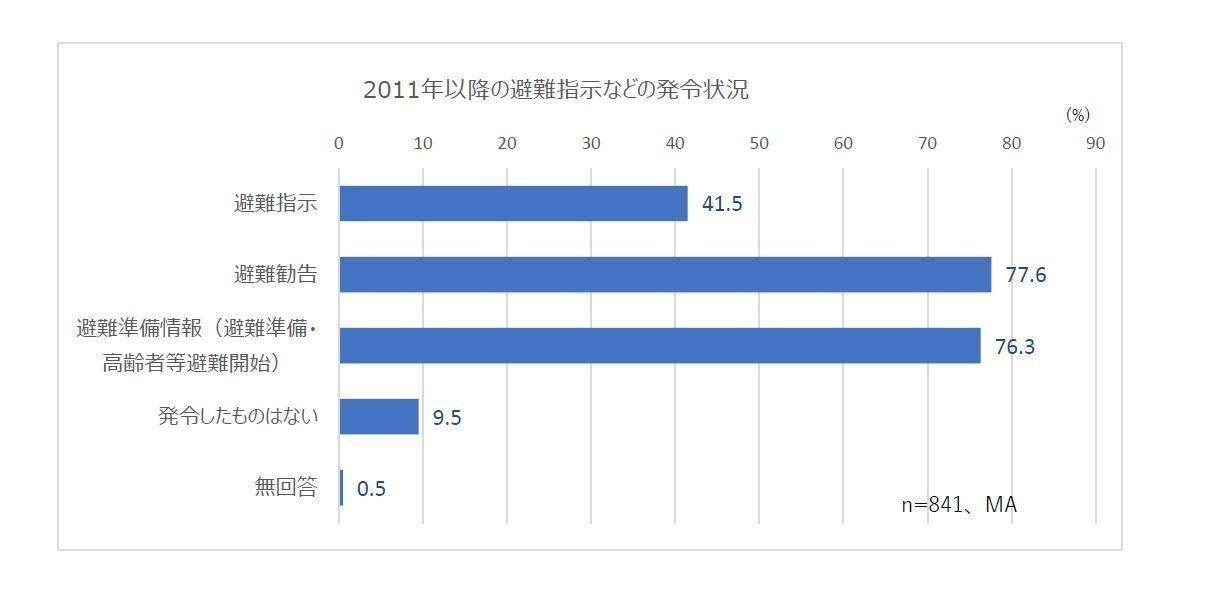 また、2011年以降、避難勧告、避難準備情報を発令した自治体は76.3%に上る結果に。避難指示まで含めると実に9割の自治体がいずれかの発令をしたことになります。