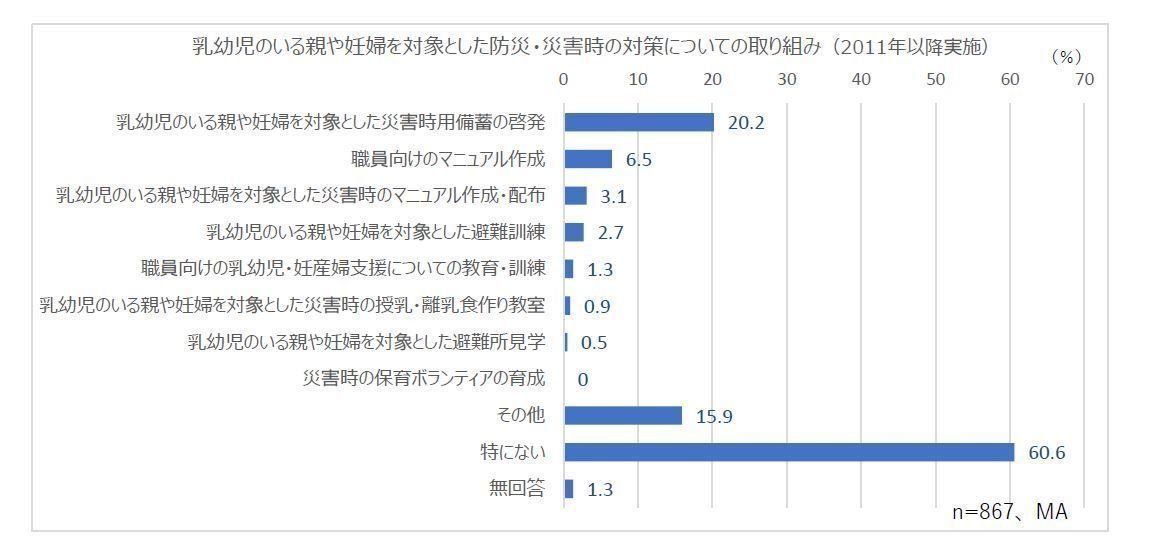 上の図は、東日本大震災以降に各自治体が実施した「乳幼児のいる親や妊婦を対象とした防災・災害時の対策についての具体的な取り組み」をグラフにしたものです。