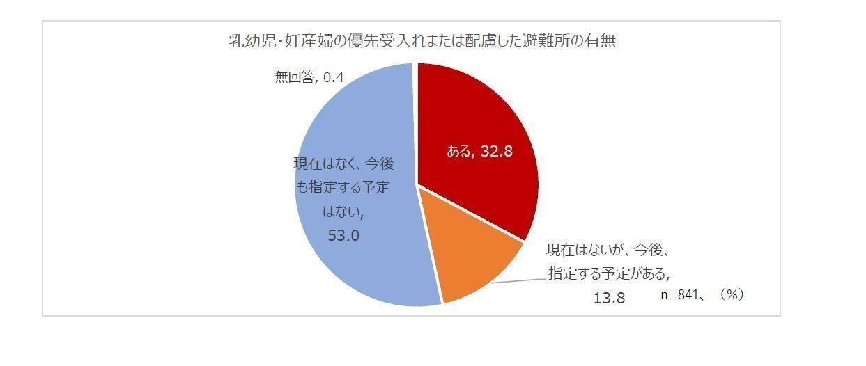 災害時に「乳幼児・妊産婦等の要援護者を優先して受け入れる避難所」または「乳幼児・妊産婦に配慮した避難所」として想定している避難所の有無については、上の円グラフの通り、約3割の自治体が「ある」、約1割が「現在はないが、今後、指定する予定がある」と回答。一方で半数以上の自治体が「現在もなく、今後も指定する予定はない」と回答しました。