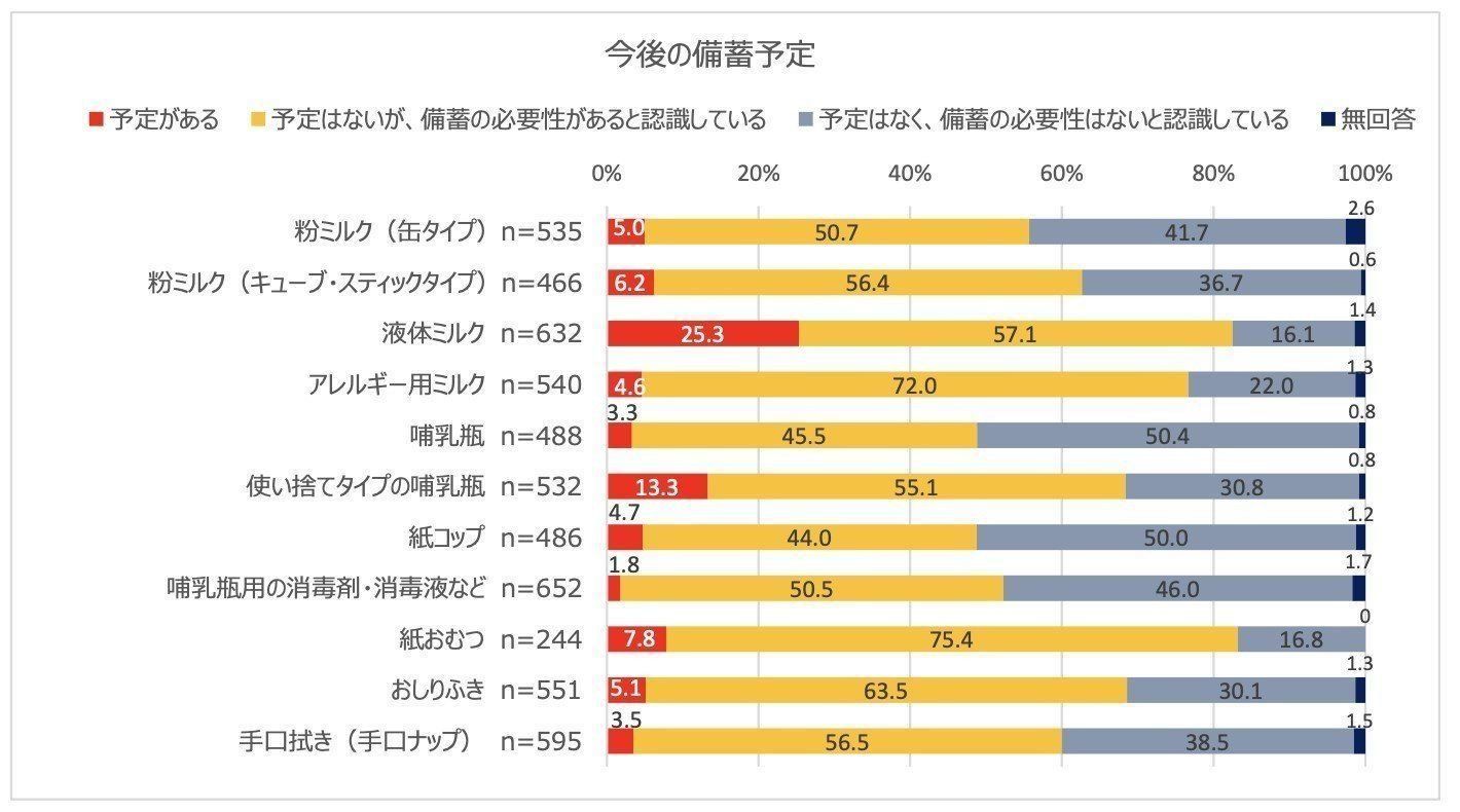 さらに、「予定はないが、備蓄の必要性があると認識している」は57.1%にも。お湯の用意がいらない液体ミルクは「災害時の備蓄として必要である」という認識が広がっているようです。