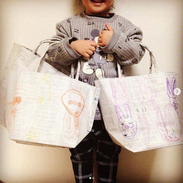 娘さんと一緒に新聞紙でバッグを作ったというSachiyoさん。新聞紙を折って水のりをつけ、形が出来上がったバッグにお絵かきすれば完成!世界に一つだけのオリジナルバッグでお買い物ごっこも盛り上がりそう。