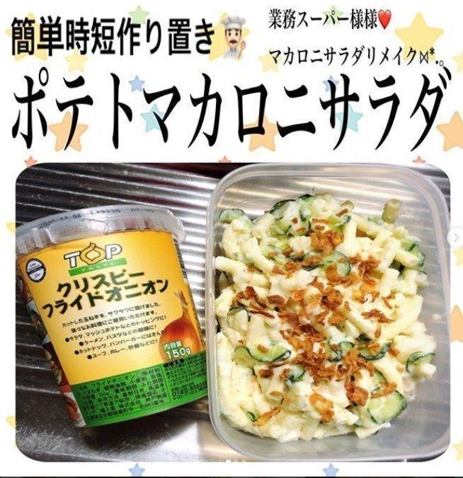 ゆかぴ【武HOME】ごはん垢さんは、業務スーパーのマカロニサラダにきゅうりとじゃがいもをプラス、さらに業務スーパーのフライドオニオンをトッピングしたポテトマカロニサラダへアレンジ♪ フライドオニオンをトッピングすればさらに美味しくなるそうですよ!お子さんも好きなポテトサラダは「もう一品欲しい!」ってときに簡単につくれるといいですよね。